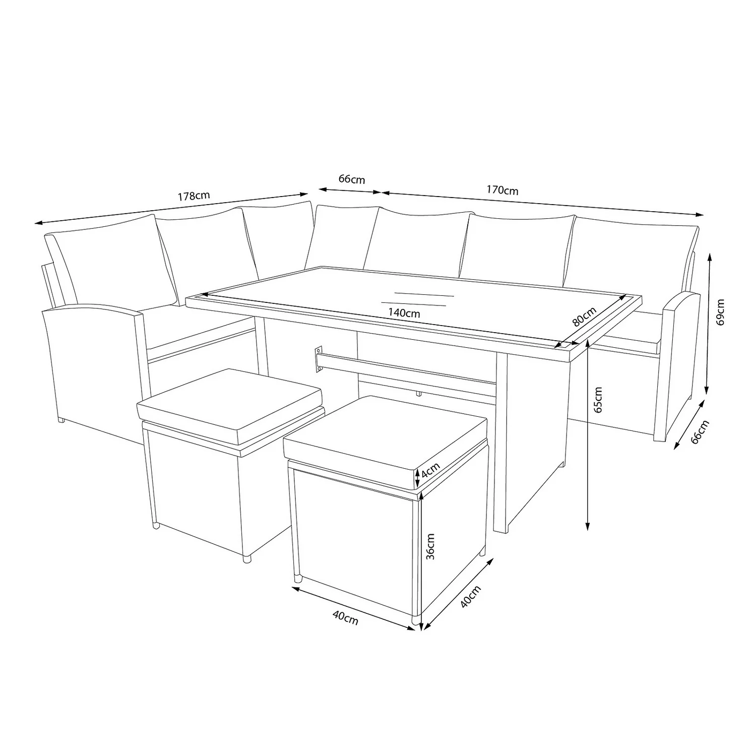Perfect for entertaining guests outdoors on warm sunny days, this contemporary Matara rattan effect garden corner sofa set will add a modern feel to any garden or patio. Comprising of sofa, L-shaped sofa, table, two cushioned footstools and both seat and back cushions, this versatile dining set can be quickly transformed from a dining set into a lounge set. Ideal for both indoor and outdoor use, this stylish dining set is constructed with powder-coated steel frame and hand woven synthetic rattan.
